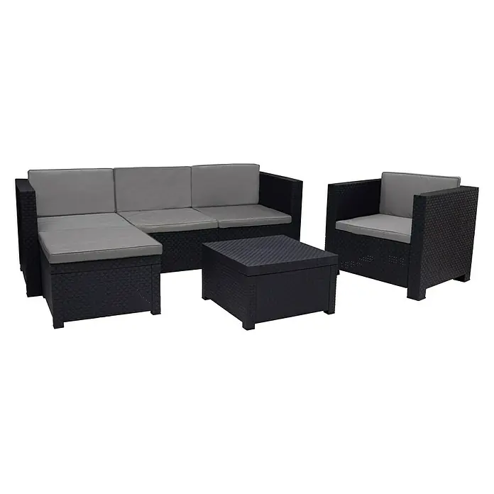 “Conjunto de muebles Manhattan de ratán plano, compuesto por sofá de tres plazas de 190x66xh72 cm, sillón de 74x66xh72 cm, mesa de 57x57xh34 cm y reposapiés de 56x56xh39 cm, incluye cojines grises de 4,5 cm, totalmente resistente a la oxidación y diseñado para ofrecer comodidad, durabilidad y estilo en jardín o terraza, recomendable protegerlos con funda en temporadas de no uso.”
